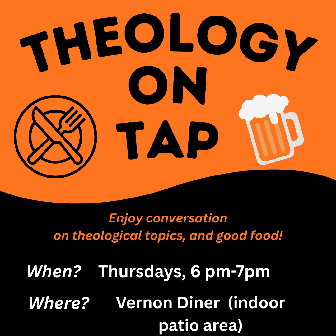 Theology on Tap is now at Vernon Diner! We meet Thursdays from 6-7pm, to discuss theology, enjoy good food, drink and company. Meet us over in the indoor patio area (heated!) by the entrance.